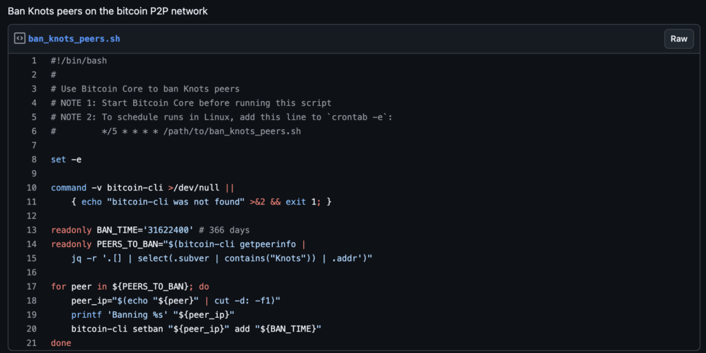 In a rapid escalation, a separate contributor posted a public bash script to auto-ban every known node running Bitcoin Knots, a policy-opposed implementation now representing approximately 13 percent of reachable Bitcoin peers.