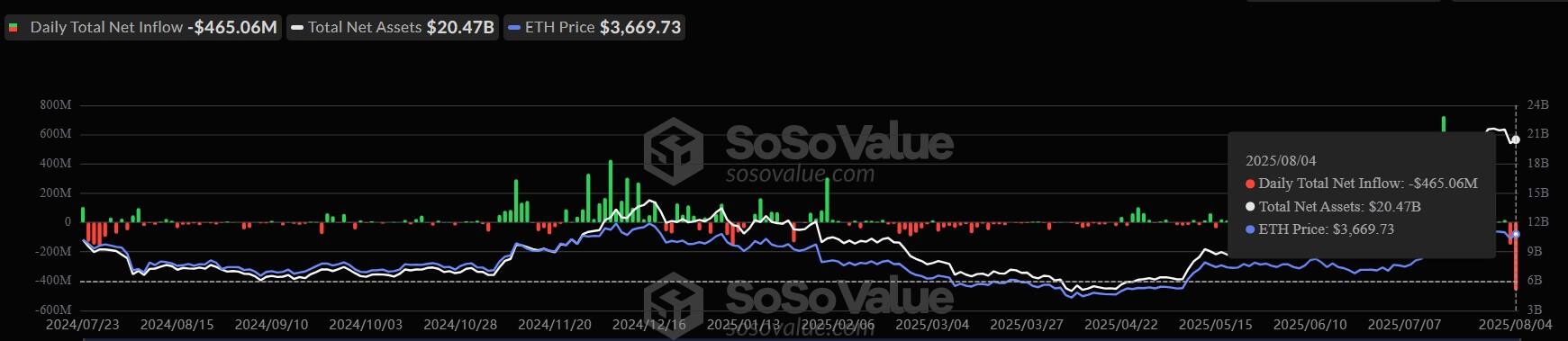 Spot Ethereum ETFs see record $465M outflow, led by BlackRock’s ETHA
