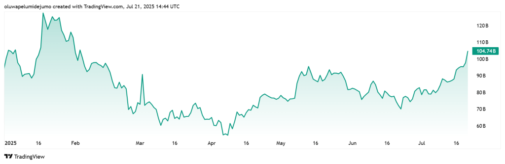 Solana’s market cap has climbed back above the $100 billion threshold, driven by a broader crypto market recovery that is lifting the value of major altcoins.