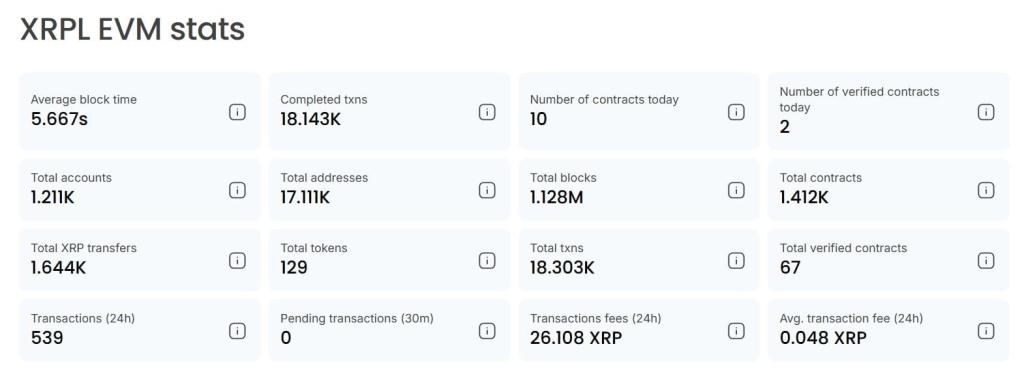 From a technical standpoint, the XRPL EVM sidechain appears to be operating smoothly. The network has already processed over 1.12 million blocks with an average block time of just 5.66 seconds.